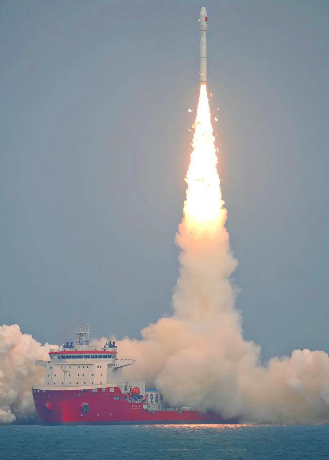 碧波之上,晨光熹微。“引力一号(遥二)·海澜之家号”运载火箭静静矗立在黄海海域的发射平台上,引弓待发。